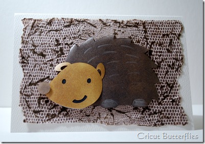 I made this cut using design studio and two cricut cartridge: Opposites Attract and George and Basic Shapes. If you would like the cut file for this card please leave a comment on this post and include your email address and I will send you the cut file. The background of the card was made using patterned tissue paper which I screwed up and tore and then inked with a Tim Holtz distress ink pad. TFL